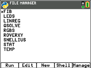 The file manager gives quick access to Python programs you have saved on your calculator. From here, you can create, edit, run and manage your files.