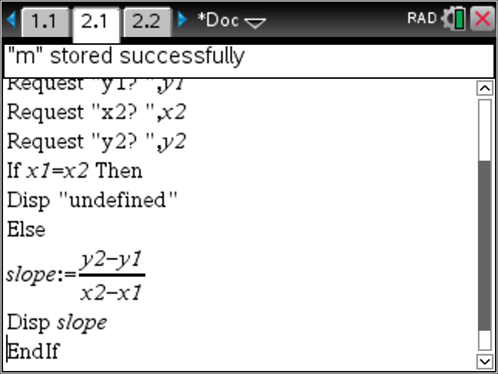 Note that the if, then, else logic requires an EndIf to close the logic statement. Now, your program will display undefined when the user uses two equivalent x-coordinates. Otherwise, it returns the slope between the two points.