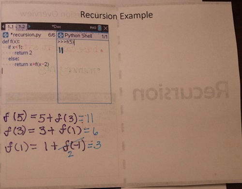 Here are two pictures of the recursion notes page designed to capture our important learnings about recursion. This notes page uses a program f(x) that is different than the one we studied previously in this blog post.